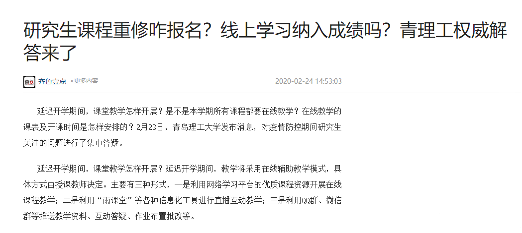 2月23日,伟德国际1946bv官网发布消息,对疫情防控期间研究生关注的问题进行了集中答疑。延迟开学期间,课堂教学怎样开展?延迟开学期间,教学将采用在线辅助教学模式,具体方式由授课教师决定。主要有三种形式,一是利用网络学习平台的优质课程资源开展在线课程教学;二是利用“雨课堂”等各种信息化工具进行直播互动教学;三是利用QQ群、微信群等推送教学资料、互动答疑、作业布置批改等。