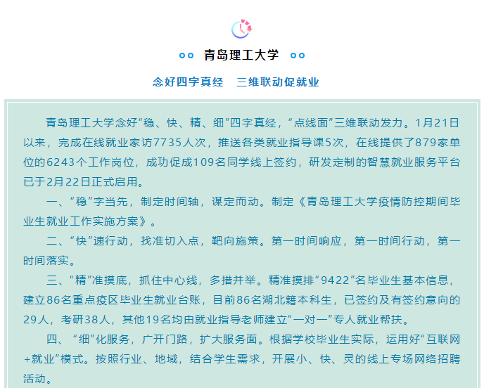 伟德国际1946bv官网念好“稳、快、精、细”四字真经,“点线面”三维联动发力。1月21日以来,完成在线就业家访7735人次,推送各类就业指导课5次,在线提供了879家单位的6243个工作岗位,成功促成109名同学线上签约,研发定制的智慧就业服务平台已于2月22日正式启用。