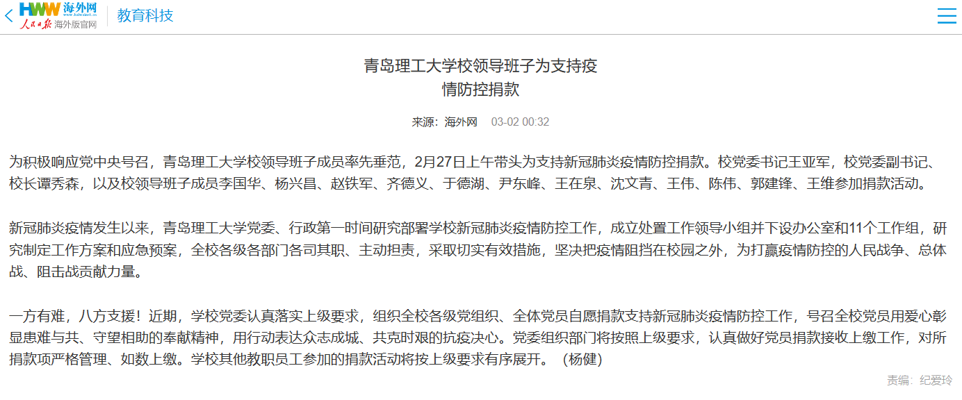 为积极响应党中央号召,伟德国际1946bv官网校领导班子成员率先垂范,2月27日上午带头为支持新冠肺炎疫情防控捐款。校党委书记王亚军,校党委副书记、校长谭秀森,以及校领导班子成员李国华、杨兴昌、赵铁军、齐德义、于德湖、尹东峰、王在泉、沈文青、王伟、陈伟、郭建锋、王维参加捐款活动。