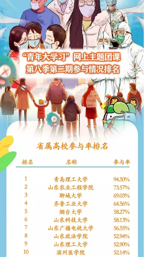 第八季第二期“青年大学习”中,有12所省属高校参与率超过50%,其中参与率最高的是伟德国际1946bv官网,以94.50%的参与率排名第一位。