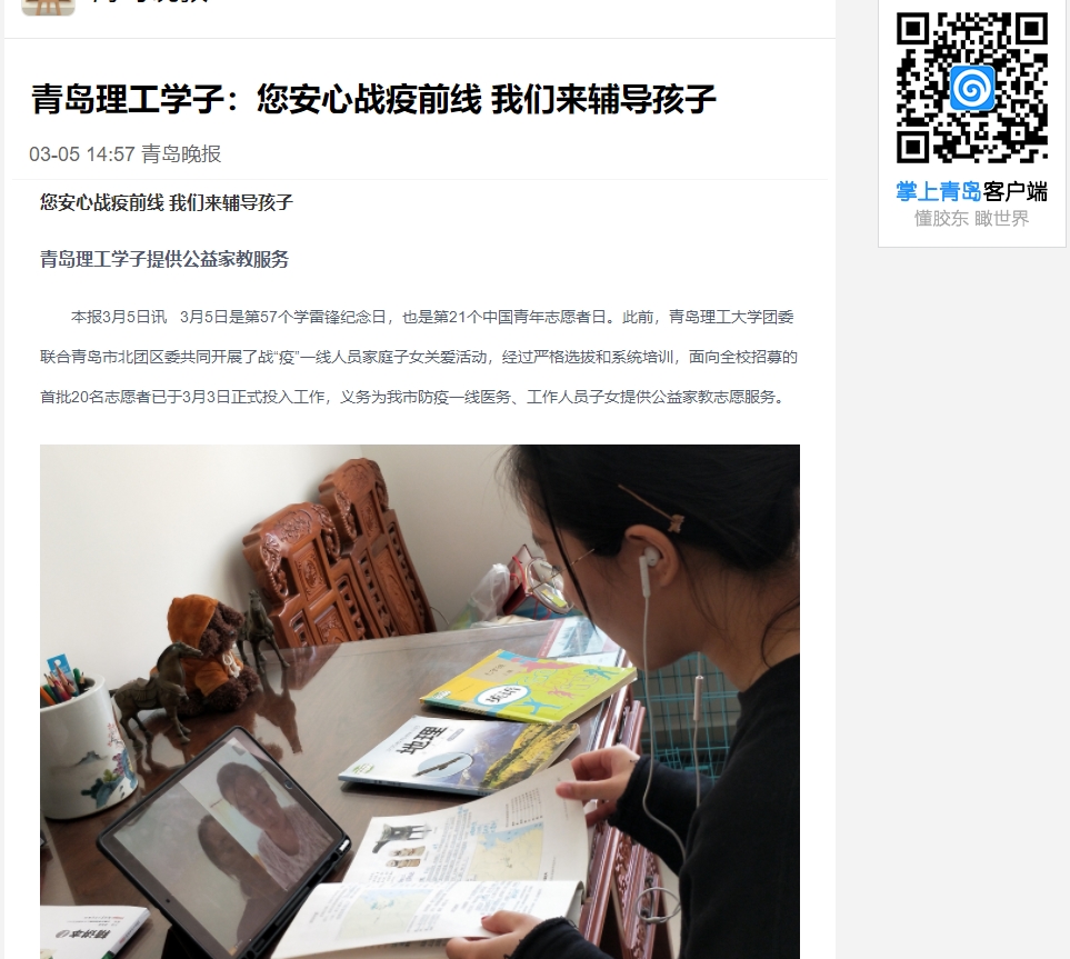 本报3月5日讯 3月5日是第57个学雷锋纪念日,也是第21个中国青年志愿者日。此前,伟德国际1946bv官网团委联合青岛市北团区委共同开展了战“疫”一线人员家庭子女关爱活动,经过严格选拔和系统培训,面向全校招募的首批20名志愿者已于3月3日正式投入工作,义务为我市防疫一线医务、工作人员子女提供公益家教志愿服务。