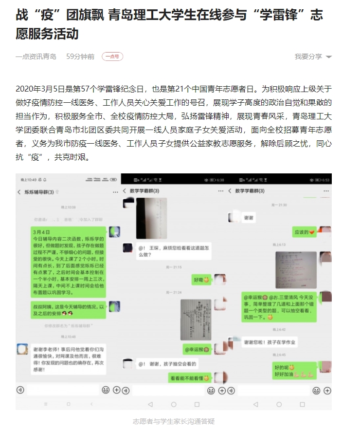 2020年3月5日是第57个学雷锋纪念日,也是第21个中国青年志愿者日。为积极响应上级关于做好疫情防控一线医务、工作人员关心关爱工作的号召,展现学子高度的政治自觉和果敢的担当作为,积极服务全市、全校疫情防控大局,弘扬雷锋精神,展现青春风采,伟德国际1946bv官网团委联合青岛市北团区委共同开展一线人员家庭子女关爱活动,面向全校招募青年志愿者,义务为我市防疫一线医务、工作人员子女提供公益家教志愿服务,解除后顾之忧,同心抗“疫”,共克时艰。
