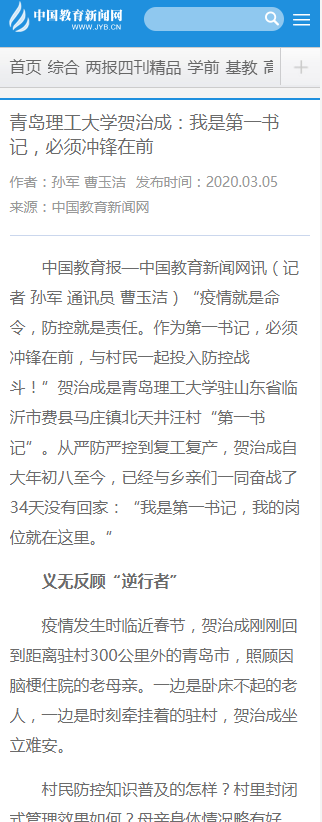 中国教育报—中国教育新闻网讯(记者 孙军 通讯员 曹玉洁)“疫情就是命令,防控就是责任。作为第一书记,必须冲锋在前,与村民一起投入防控战斗!”贺治成是伟德国际1946bv官网驻山东省临沂市费县马庄镇北天井汪村“第一书记”。从严防严控到复工复产,贺治成自大年初八至今,已经与乡亲们一同奋战了34天没有回家:“我是第一书记,我的岗位就在这里。”