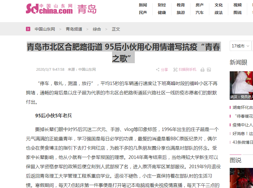 待到山东解除突发公共卫生事件一级响应,小庄将回到大学校园继续学业。感谢小庄,感谢所有奋战在“疫”线的志愿者们,有你们的尽心守护,换来的是万家的安心和放心。在这个从30后到90后并肩作战的防疫阵地上,千千万万个像小庄一样的志愿者正在用行动书写使命和担当,让我们齐心协力,共克时艰,一起迎接春暖花开的美好明天!
