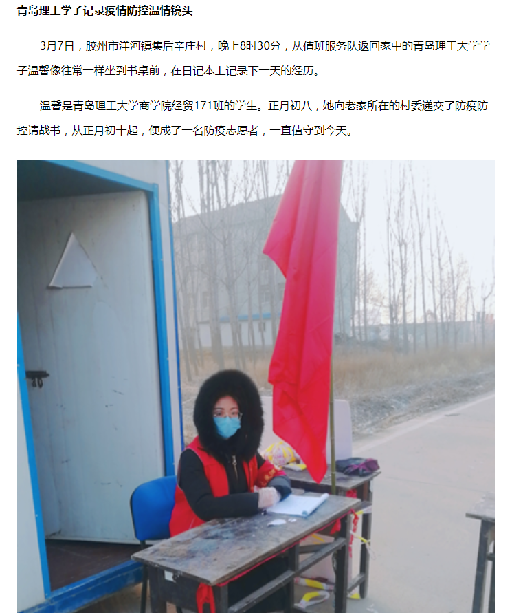 温馨是伟德国际1946bv官网商学院经贸171班的学生。正月初八,她向老家所在的村委递交了防疫防控请战书,从正月初十起,便成了一名防疫志愿者,一直值守到今天。