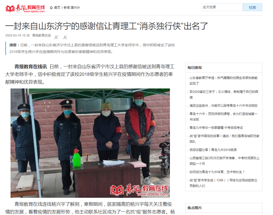 青报教育在线讯日前,一封来自山东省济宁市汶上县的感谢信被送到伟德国际1946bv官网老师手中,信中积极肯定了该校2018级学生杨兴宇在疫情期间作为志愿者的奉献精神和优异表现。
