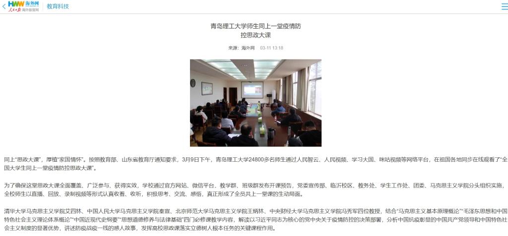 同上“思政大课”,厚植“家国情怀”。按照教育部、山东省教育厅通知要求,3月9日下午,伟德国际1946bv官网24800多名师生通过人民智云、人民视频、学习大国、咪咕视频等网络平台,在祖国各地同步在线观看了“全国大学生同上一堂疫情防控思政大课”。