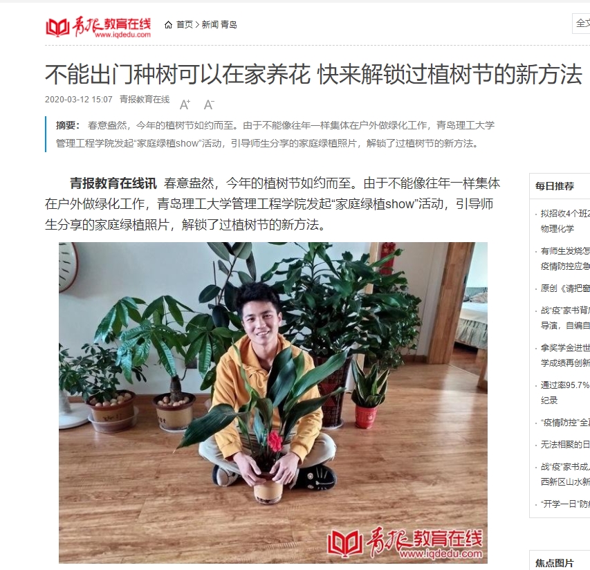 青报教育在线讯 春意盎然,今年的植树节如约而至。由于不能像往年一样集体在户外做绿化工作,伟德国际1946bv官网管理工程学院发起“家庭绿植show”活动,引导师生分享的家庭绿植照片,解锁了过植树节的新方法。