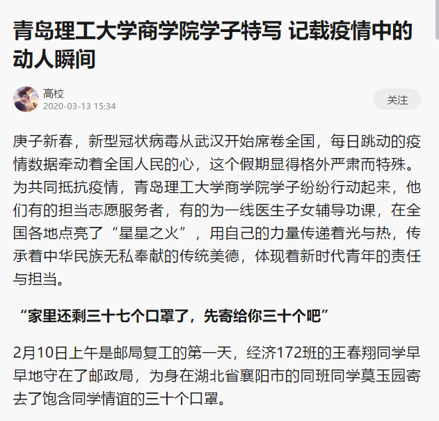 2月初正处在疫情爆发的时期,家在山东淄博的王春翔在了解到莫玉园家中急缺口罩的情况后,就立即把家中仅存的30个未开封的口罩寄了过去。为莫玉园寄过去三十个口罩后,王春翔家只剩七个口罩了。但王春翔却说,自己家中口罩不够没关系,山东地区不比湖北,自己会避免不必要的出门,湖北地区疫情较重、物资紧缺,比自己更需要口罩。王春翔先人后己的无私精神不仅帮助了同学,传递出的大爱和友善更影响着整个商学院,在学院掀起了口罩互助行动的良好风气。