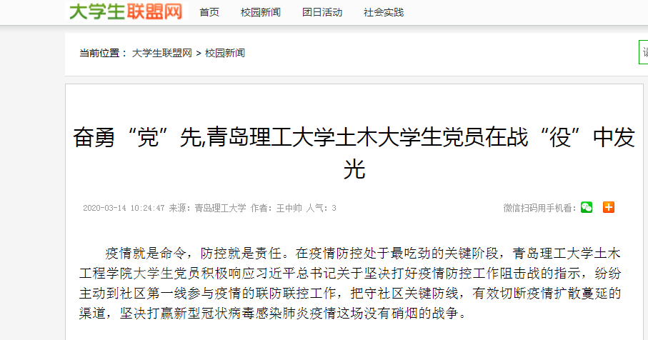 新冠肺炎疫情给奋战在联防联控一线的伟德国际1946bv官网土木大学生党员带来了严峻考验,也涤荡着他们的心灵、磨炼着他们的意志。相信全体大学生党员一定会把身份亮出来,把责任扛起来,把标杆立起来,危难时刻挺身而出,在防控战役中淬炼青春底色,发光发热,展现新时代大学生党员的奉献精神和敢于担当的使命感。