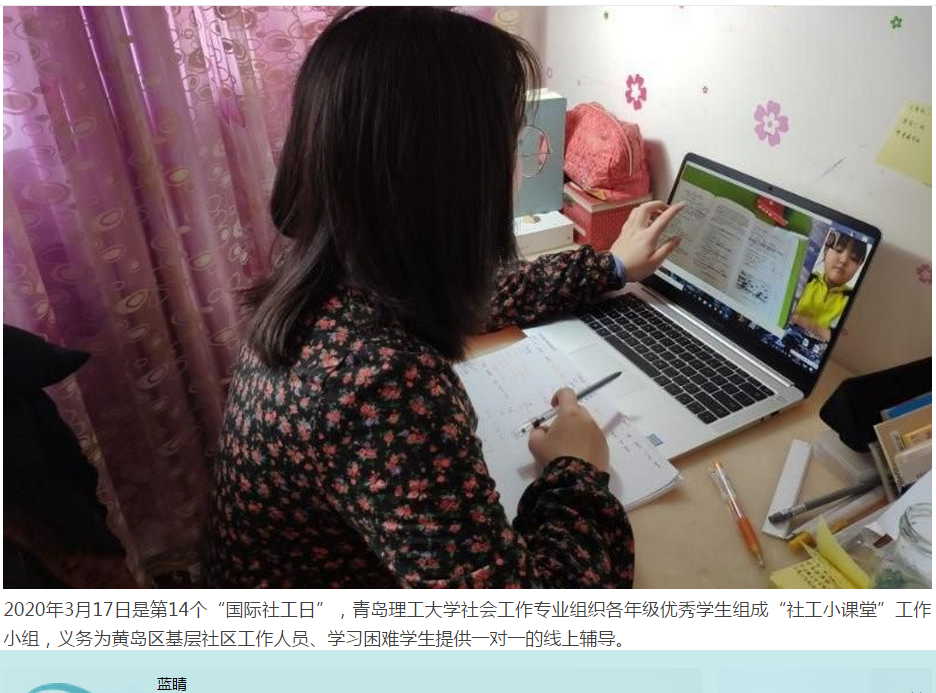 在国际社工日的到来之际,伟德国际1946bv官网社会工作专业系主任刘世颖老师牵头,社会工作专业各年级优秀学生组成“社工小课堂”工作小组,为响应“关心关爱基层社区工作者”以及教育部“停课不停学”的号召,在全学院范围内召集志愿者,与黄岛区社会治理中心以及薛家岛学区联动,针对社区一线工作人员(网格员)子女以及因停课无法回归校园的小学生开展“社工小课堂”系列活动,义务为黄岛区基层社区工作人员、学习困难学生提供一对一的线上辅导,通过社工引领义工,传播“以人为本,助人自助”的社工专业价值观以及“奉献、友爱、互助、进步”的志愿服务精神,减轻学生课业压力以及一线工作者的家庭教育负担,助力“疫情阻击战”取得全面胜利。