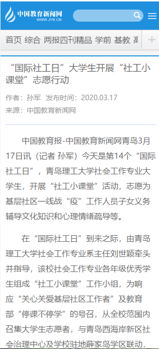 中国教育报-中国教育新闻网青岛3月17日讯(记者 孙军)今天是第14个“国际社工日”,伟德国际1946bv官网社会工作专业大学生,开展“社工小课堂”活动,志愿为基层社区一线战“疫”工作人员子女义务辅导文化知识和心理情绪疏导等。