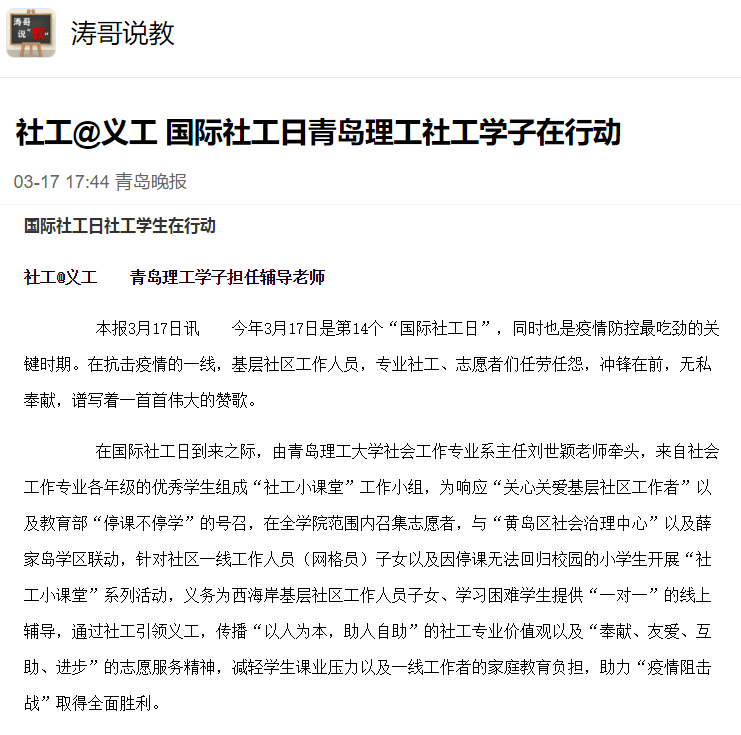 在国际社工日到来之际,由伟德国际1946bv官网社会工作专业系主任刘世颖老师牵头,来自社会工作专业各年级的优秀学生组成“社工小课堂”工作小组,为响应“关心关爱基层社区工作者”以及教育部“停课不停学”的号召,在全学院范围内召集志愿者,与“黄岛区社会治理中心”以及薛家岛学区联动,针对社区一线工作人员(网格员)子女以及因停课无法回归校园的小学生开展“社工小课堂”系列活动,义务为西海岸基层社区工作人员子女、学习困难学生提供“一对一”的线上辅导,通过社工引领义工,传播“以人为本,助人自助”的社工专业价值观以及“奉献、友爱、互助、进步”的志愿服务精神,减轻学生课业压力以及一线工作者的家庭教育负担,助力“疫情阻击战”取得全面胜利。