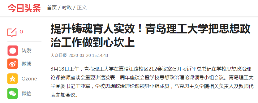 2019年,伟德国际1946bv官网聚焦思政课改革创新多点发力,思政课建设初见成效:对标新时代思政课改革创新提出的新任务新标准,及时出台了《中共伟德国际1946bv官网委员会关于深化新时代思想政治理论课改革创新的实施意见》《伟德国际1946bv官网思政课教师队伍建设办法》,强力推动“顶层设计”和“基层落实”制度化进程;发起成立“青岛新时代大中小学思政课一体化建设联盟”,为邻学段、同学段、跨学段相互听课集体备课、思政课“堵点”集体攻关及思政课教学资源共享搭建平台;与城发投资集团合作的“新时代国企党建协同创新中心”,探讨了校企双方党建共建多元化合作发展新模式的创新举措,在党建创新、平台建设、人才培养、教育实践、企业文化、课题研究等方面建立长效战略合作机制,开展一系列务实合作;着力推动思政课“小课堂”和社会“大课堂”深度融合,鼓励思政课教师担任思政类学生社团的指导教师,疫情期间首批9名指导教师开展了线上指导,引导大学生做爱国担当奉献、有家国情怀的新时代青年。