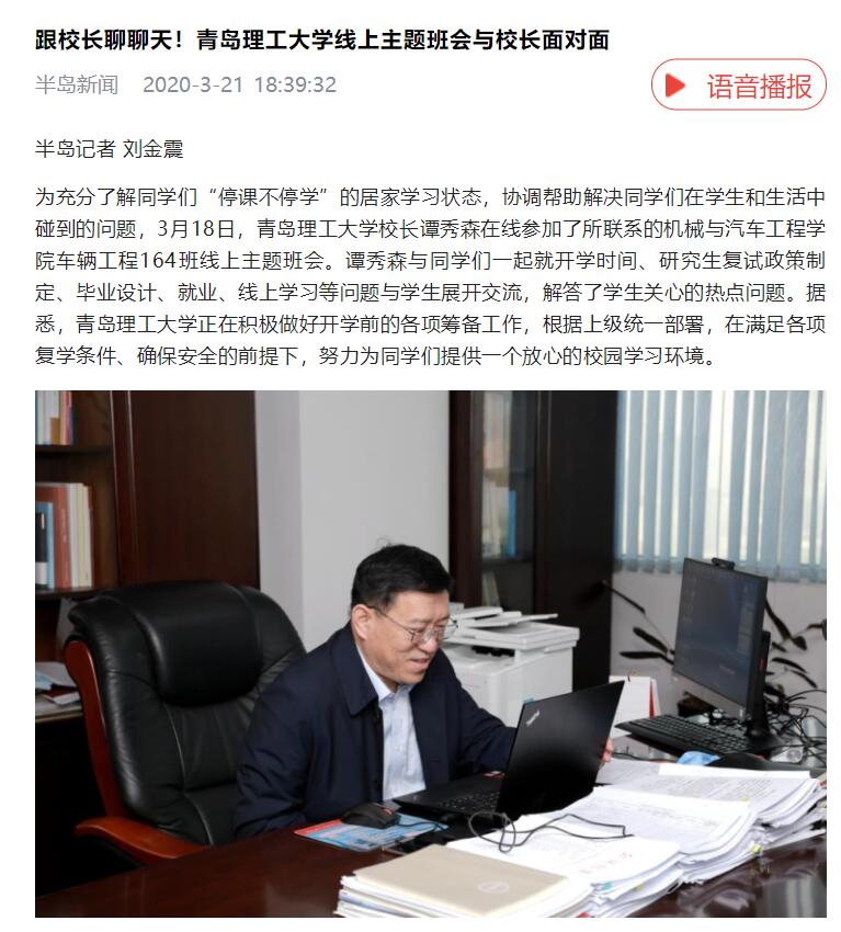 为充分了解同学们“停课不停学”的居家学习状态,协调帮助解决同学们在学生和生活中碰到的问题,3月18日,伟德国际1946bv官网校长谭秀森在线参加了所联系的机械与汽车工程学院车辆工程164班线上主题班会。谭秀森与同学们一起就开学时间、研究生复试政策制定、毕业设计、就业、线上学习等问题与学生展开交流,解答了学生关心的热点问题。据悉,伟德国际1946bv官网正在积极做好开学前的各项筹备工作,根据上级统一部署,在满足各项复学条件、确保安全的前提下,努力为同学们提供一个放心的校园学习环境。
