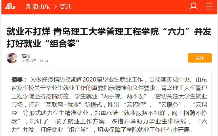 为做好疫情防控期间2020届毕业生就业工作,贯彻落实党中央、山东省及学校关于毕业生就业工作的重要指示精神和文件要求,伟德国际1946bv官网管理工程学院坚持疫情防控、学生就业“两手抓、两不误”,密切关注大学生就业市场,打造“互联网+就业”新模式,推出 “云招聘”、“云服务”、“云指导”等形式助力学生精准就业,郑重承诺“就业服务不打烊,网上招聘不停歇”,制订了一揽子就业工作方案,多措并举助力毕业生求职战, “六力”并发,打好就业“组合拳”,切实保障了学院就业工作的有序开展。