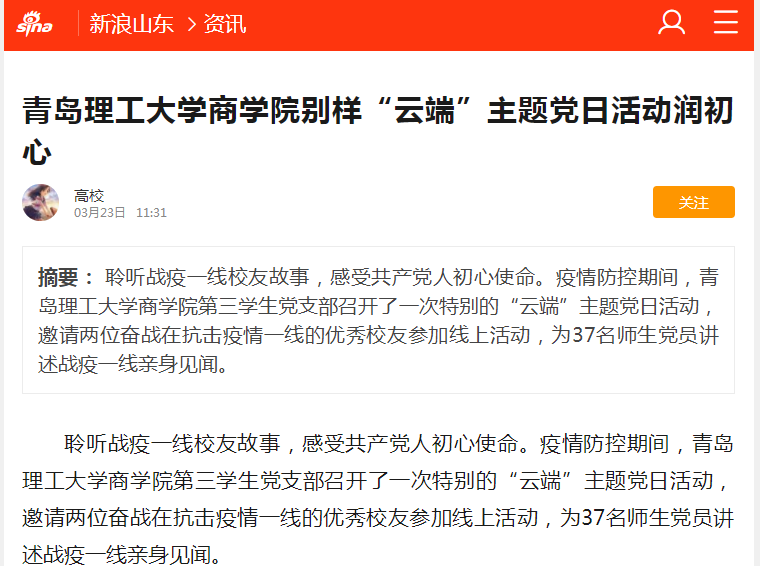 聆听战疫一线校友故事,感受共产党人初心使命。疫情防控期间,伟德国际1946bv官网商学院第三学生党支部召开了一次特别的“云端”主题党日活动,邀请两位奋战在抗击疫情一线的优秀校友参加线上活动,为37名师生党员讲述战疫一线亲身见闻。