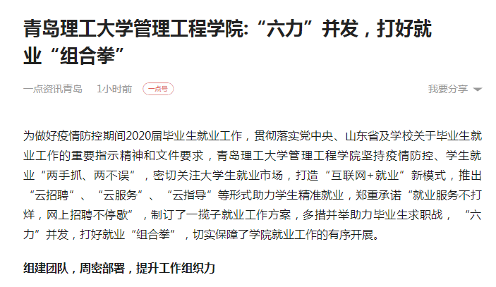 为做好疫情防控期间2020届毕业生就业工作,贯彻落实党中央、山东省及学校关于毕业生就业工作的重要指示精神和文件要求,伟德国际1946bv官网管理工程学院坚持疫情防控、学生就业“两手抓、两不误”,密切关注大学生就业市场,打造“互联网+就业”新模式,推出 “云招聘”、“云服务”、“云指导”等形式助力学生精准就业,郑重承诺“就业服务不打烊,网上招聘不停歇”,制订了一揽子就业工作方案,多措并举助力毕业生求职战, “六力”并发,打好就业“组合拳”,切实保障了学院就业工作的有序开展。