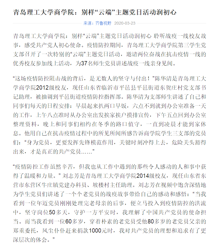 伟德国际1946bv官网商学院:别样“云端”主题党日活动润初心 聆听战疫一线校友故事,感受共产党人初心使命。疫情防控期间,伟德国际1946bv官网商学院第三学生党支部召开了一次特别的“云端”主题党日活动,邀请两位奋战在抗击疫情一线的优秀校友参加线上活动,为37名师生党员讲述战疫一线亲身见闻。
