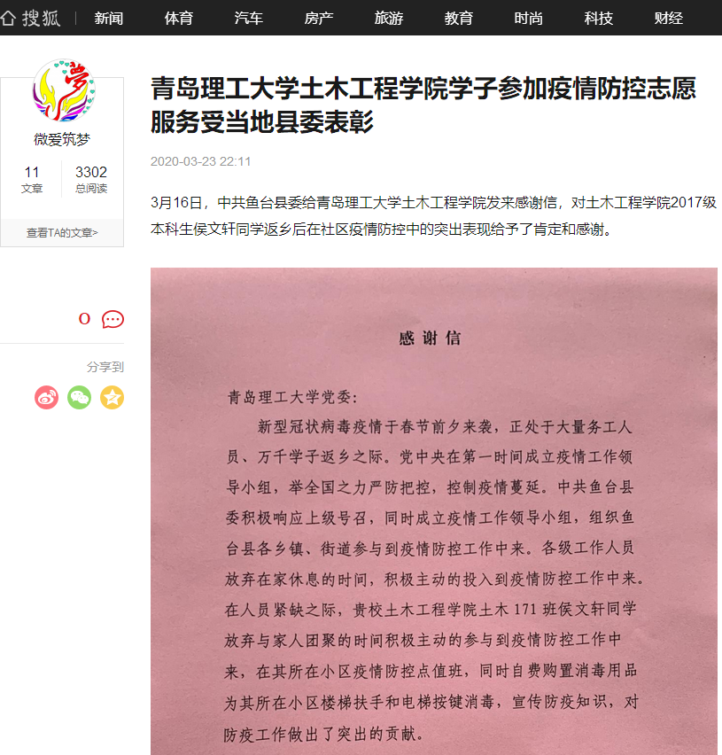 3月16日,中共鱼台县委给伟德国际1946bv官网土木工程学院发来感谢信,对土木工程学院2017级本科生侯文轩同学返乡后在社区疫情防控中的突出表现给予了肯定和感谢。
