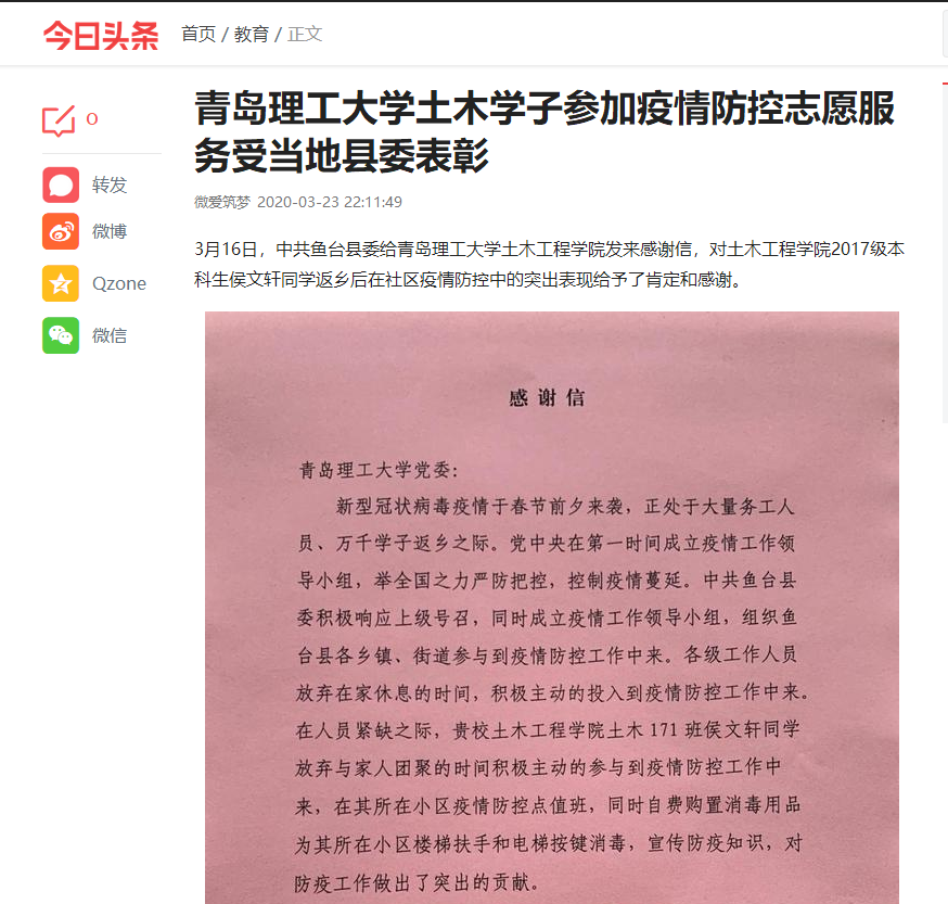 3月16日,中共鱼台县委给伟德国际1946bv官网土木工程学院发来感谢信,对土木工程学院2017级本科生侯文轩同学返乡后在社区疫情防控中的突出表现给予了肯定和感谢。