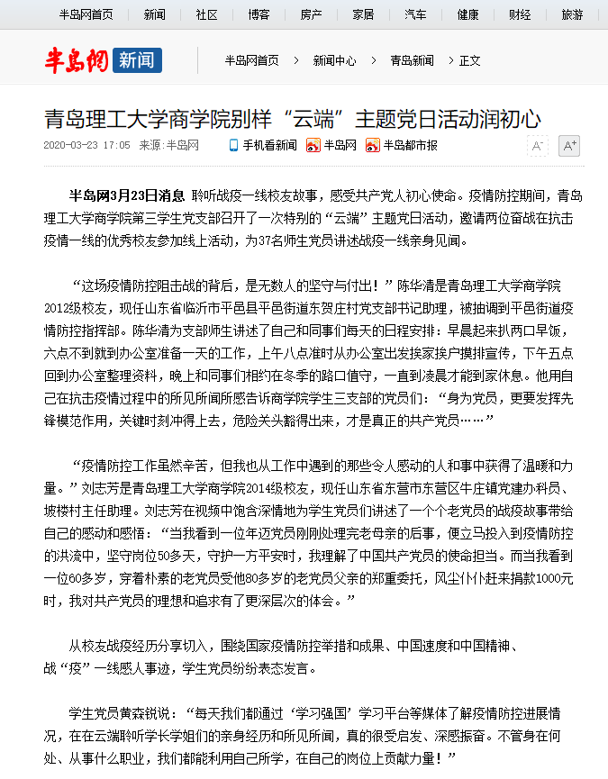 聆听战疫一线校友故事,感受共产党人初心使命。疫情防控期间,伟德国际1946bv官网商学院第三学生党支部召开了一次特别的“云端”主题党日活动,邀请两位奋战在抗击疫情一线的优秀校友参加线上活动,为37名师生党员讲述战疫一线亲身见闻。