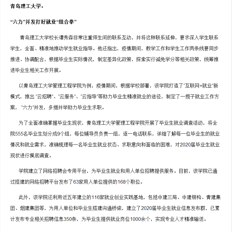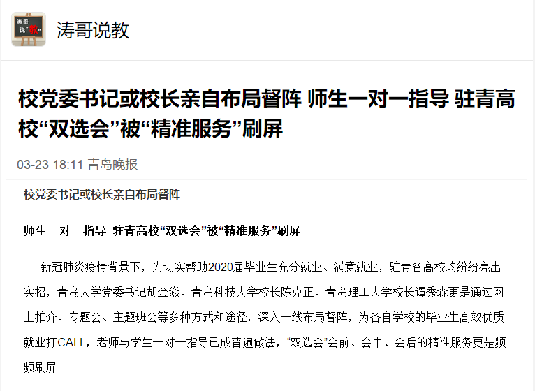 新冠肺炎疫情背景下,为切实帮助2020届毕业生充分就业、满意就业,驻青各高校均纷纷亮出实招,青岛大学党委书记胡金焱、青岛科技大学校长陈克正、伟德国际1946bv官网校长谭秀森更是通过网上推介、专题会、主题班会等多种方式和途径,深入一线布局督阵,为各自学校的毕业生高效优质就业打CALL,老师与学生一对一指导已成普遍做法,“双选会”会前、会中、会后的精准服务更是频频刷屏。