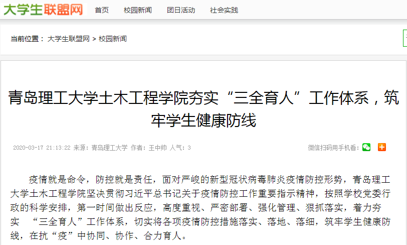 疫情就是命令,防控就是责任,面对严峻的新型冠状病毒肺炎疫情防控形势,伟德国际1946bv官网土木工程学院坚决贯彻习近平总书记关于疫情防控工作重要指示精神,按照学校党委行政的科学安排,第一时间做出反应,高度重视、严密部署、强化管理、狠抓落实,着力夯实“三全育人”工作体系,切实将各项疫情防控措施落实、落地、落细,筑牢学生健康防线,在抗“疫”中协同、协作、合力育人。