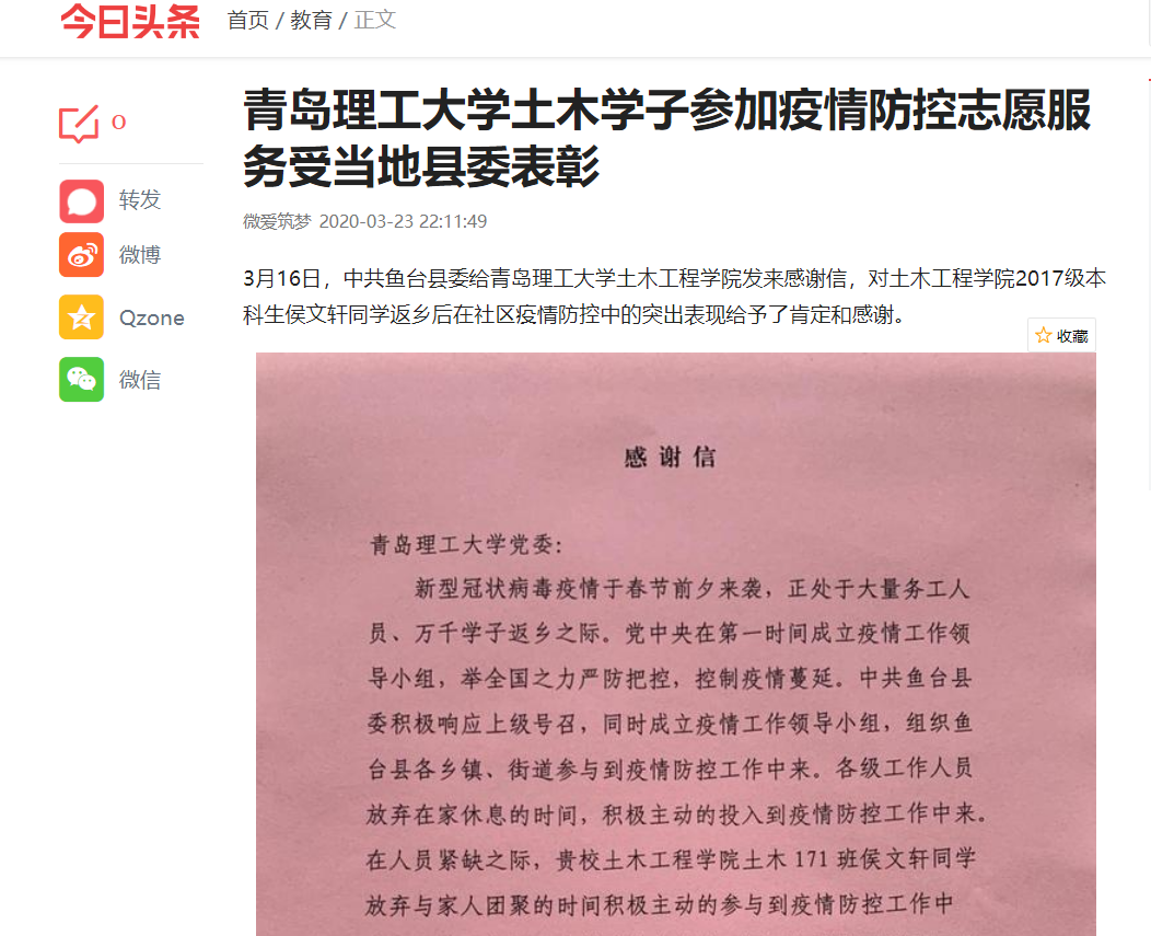 3月16日,中共鱼台县委给伟德国际1946bv官网土木工程学院发来感谢信,对土木工程学院2017级本科生侯文轩同学返乡后在社区疫情防控中的突出表现给予了肯定和感谢。