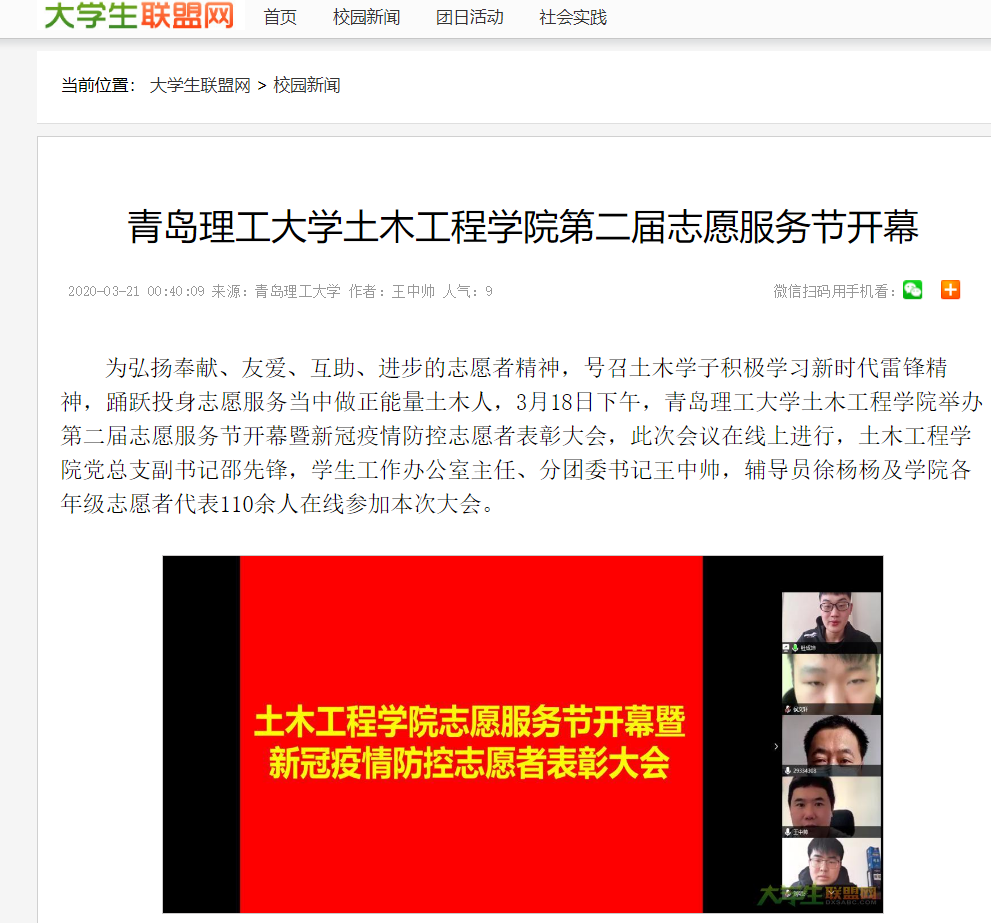 为弘扬奉献、友爱、互助、进步的志愿者精神,号召土木学子积极学习新时代雷锋精神,踊跃投身志愿服务当中做正能量土木人,3月18日下午,伟德国际1946bv官网土木工程学院举办第二届志愿服务节开幕暨新冠疫情防控志愿者表彰大会,此次会议在线上进行,土木工程学院党总支副书记邵先锋,学生工作办公室主任、分团委书记王中帅,辅导员徐杨杨及学院各年级志愿者代表110余人在线参加本次大会。