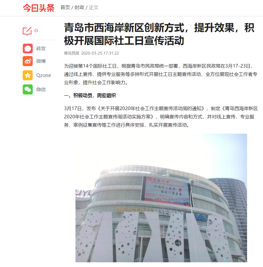 3月17日,发布《关于开展2020年社会工作主题宣传活动周的通知》,制定《青岛西海岸新区2020年社会工作主题宣传周活动实施方案》,明确宣传内容和方式,并对线上宣传、专业服务、案例征集宣传等工作进行具体安排,扎实开展宣传活动。