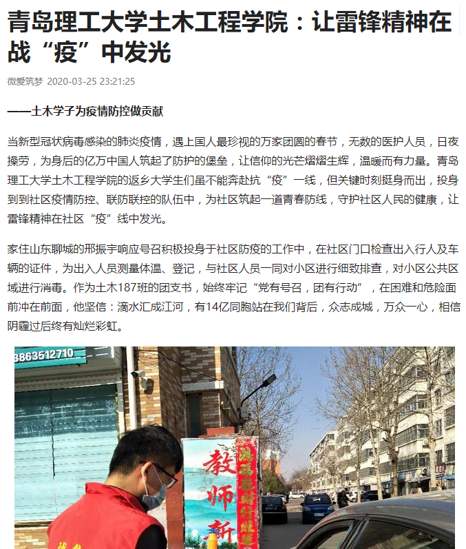 伟德国际1946bv官网土木工程学院学子们为战“疫”胜利坚守岗位、奉献自我。这一刻,他们就是雷锋精神的时代传承人。大写的青春里应有大写的家国情怀,要让青春走出孤芳自赏的小我,把自己的小我融入祖国的大我,人民的大我,与时代同步伐、与人民共命运。要把雷锋精神融入血液践于行动,从点滴做起,从小事做起,传递正能量,一直与疫情战斗下去,直到胜利那一天,让雷锋精神在战“疫”中发光!
