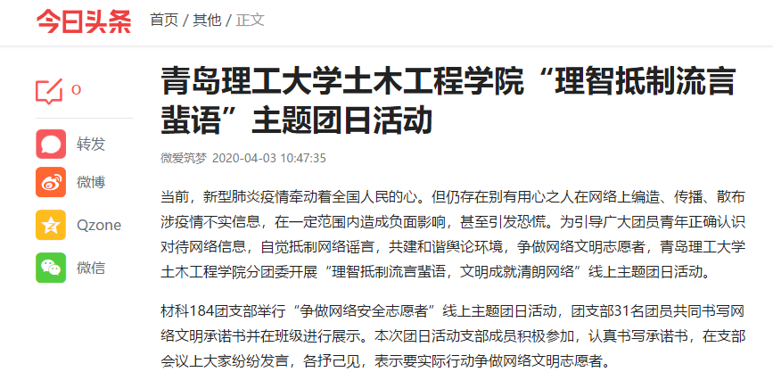 当前,新型肺炎疫情牵动着全国人民的心。但仍存在别有用心之人在网络上编造、传播、散布涉疫情不实信息,在一定范围内造成负面影响,甚至引发恐慌。为引导广大团员青年正确认识对待网络信息,自觉抵制网络谣言,共建和谐舆论环境,争做网络文明志愿者,伟德国际1946bv官网土木工程学院分团委开展“理智抵制流言蜚语,文明成就清朗网络”线上主题团日活动。