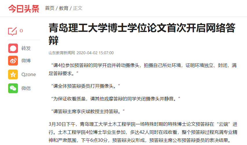 针对本次云答辩,陈际洲同学用“组织有序,节奏紧凑”来评价,他认为,相比于传统的线下答辩形式,云答辩能够自主选择最佳的环境,全身心投入到答辩环节中,同时,云答辩形式方便专家、旁听者全程收看,互动充分。但是,相比于线下答辩,云答辩需要做大量的前期准备工作,主要包括提前测试设备和网络,保证室内光线充足,熟练操作云答辩会议系统,熟悉答辩流程,针对信号中断等突发状况做应急好预案等。