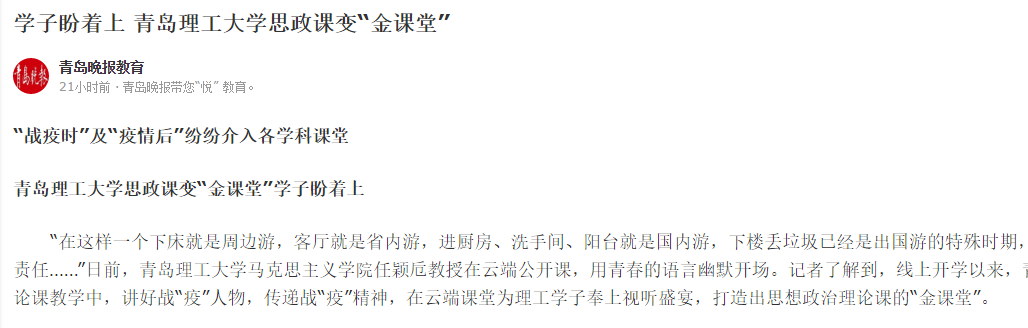 “跟以往思政课不同,虽然是线上,但由于老师们介绍的都是发生在我们自己身上或身边的真实故事,我们本身就是经历者,所以听起来特别有劲儿。”伟德国际1946bv官网的一名同学说,以“战疫”的内容为主导,“思政”这一公共课从此变成了自己最想上、甚至是最盼望的一节课。