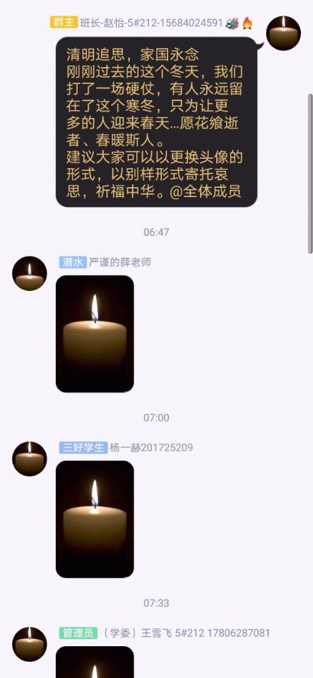 商学院的同学们同时将自己的头像更换为黑白烛光图,并以笔寄情,手写自己内心深处的敬意与感恩:“谢谢为2020带来春天,而沉眠于那个冬天的所有人,中华人民全体将永远铭记你们的付出与牺牲!”“一路走好,你们是人民的英雄!”“是你们用血肉为中国人民筑出了一条通往幸福的路。”