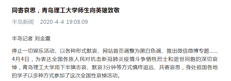 停止一切娱乐活动、以各种形式默哀、网站首页调整为黑白色调、推出微信微博专题……4月4日,为表达全国各族人民对抗击新冠肺炎疫情斗争牺牲烈士和逝世同胞的深切哀悼,伟德国际1946bv官网用下半旗志哀、默哀3分钟等方式慎终追远、共寄哀思,身处祖国各地的学子以多种方式参加了这次全国性哀悼活动。