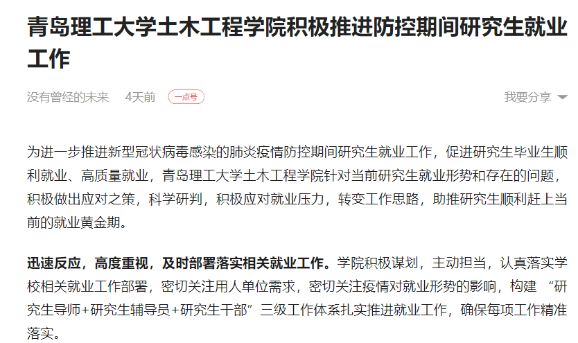 细心部署,周密安排,制定研究生就业工作方案。为应对目前疫情防控的严峻形势,提前预判,制定就业工作方案,保障研究生就业工作正常有序进行,及时公布就业信息,整理国家、山东省学校相关就业政策,搜集真实可靠的官方就业需求信息,利用毕业研究生微信群、QQ群等及时发布;加强就业咨询服务,开通就业咨询联系方式,建立毕业研究生就业咨询微信群、QQ群、线上就业互助小组等,解答毕业研究生在网上网上招聘、网上签约、面试技巧等问题;开展就业心理调适,利用各种线上方式对毕业研究生进行心理疏导,教育引导毕业研究生及时关注相关招录面试的官方通知,统筹利用好宝贵时间,积极准备,及时调整应考策略;积极开展研究生毕业教育工作,教育毕业研究生不参加人员聚集的各类招聘活动。