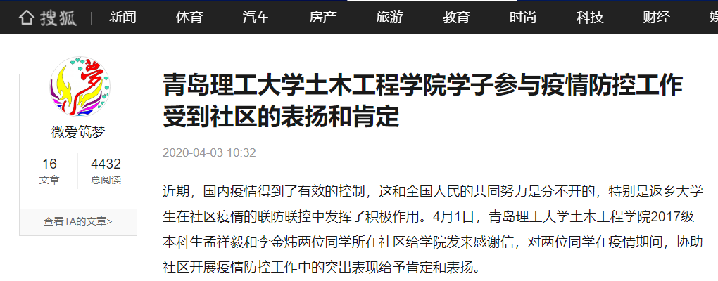 近期,国内疫情得到了有效的控制,这和全国人民的共同努力是分不开的,特别是返乡大学生在社区疫情的联防联控中发挥了积极作用。4月1日,伟德国际1946bv官网土木工程学院2017级本科生孟祥毅和李金炜两位同学所在社区给学院发来感谢信,对两位同学在疫情期间,协助社区开展疫情防控工作中的突出表现给予肯定和表扬。