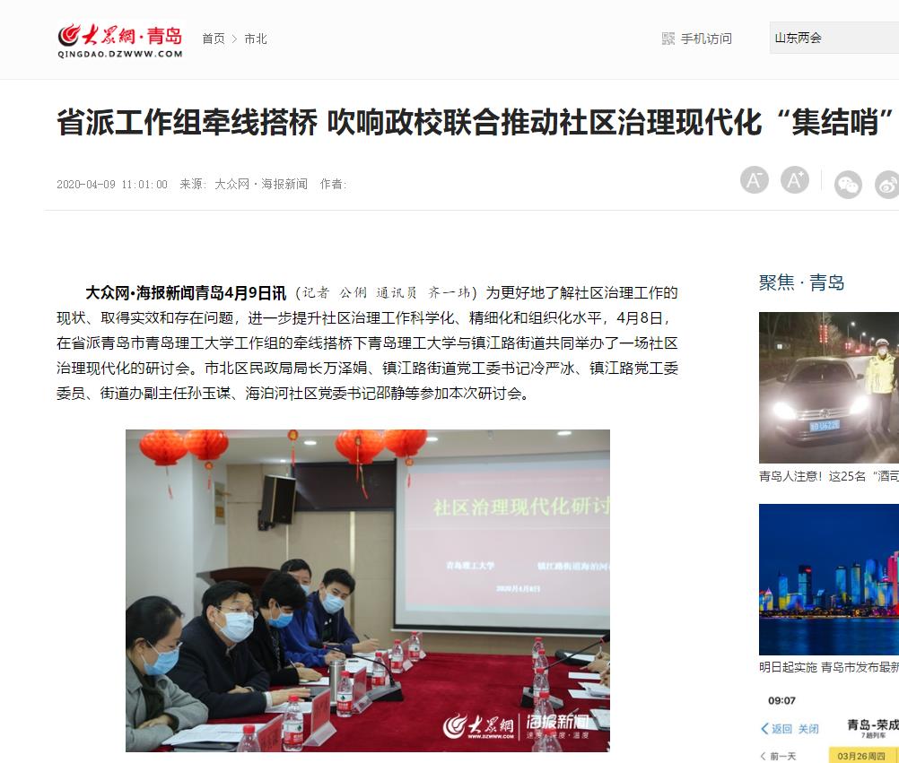 大众网·海报新闻青岛4月9日讯(记者 公俐 通讯员 齐一玮)为更好地了解社区治理工作的现状、取得实效和存在问题,进一步提升社区治理工作科学化、精细化和组织化水平,4月8日,在省派青岛市伟德国际1946bv官网工作组的牵线搭桥下伟德国际1946bv官网与镇江路街道共同举办了一场社区治理现代化的研讨会。市北区民政局局长万泽娟、镇江路街道党工委书记冷严冰、镇江路党工委委员、街道办副主任孙玉谋、海泊河社区党委书记邵静等参加本次研讨会。