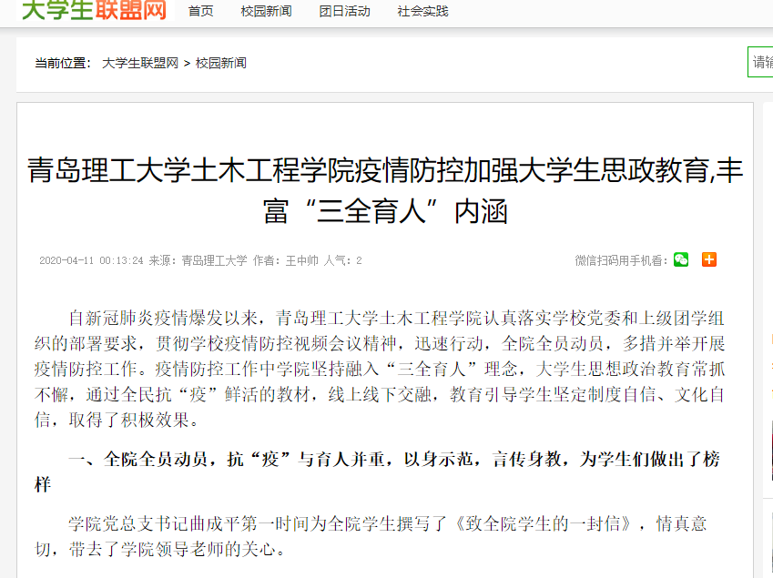 自新冠肺炎疫情爆发以来,伟德国际1946bv官网土木工程学院认真落实学校党委和上级团学组织的部署要求,贯彻学校疫情防控视频会议精神,迅速行动,全院全员动员,多措并举开展疫情防控工作。疫情防控工作中学院坚持融入“三全育人”理念,大学生思想政治教育常抓不懈,通过全民抗“疫”鲜活的教材,线上线下交融,教育引导学生坚定制度自信、文化自信,取得了积极效果。