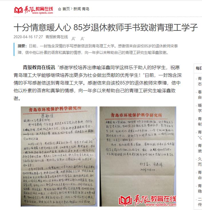 青报教育在线讯 “感谢学校培养出像喻泽鑫同学这样乐于助人的好学生,祝愿伟德国际1946bv官网能够继续培养出更多为社会做出贡献的优秀学生!”日前,一封饱含深情的手写感谢信送到伟德国际1946bv官网。感谢信来自该校85岁的退休教师宋泰璋,信中他以朴素的语言和真挚的情感,向一年多以来帮助自己的青理工研究生喻泽鑫致谢。