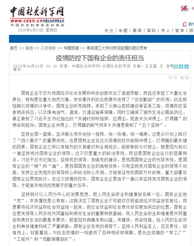 国有企业不仅担负着疫情防控的保障工作,而且还承担着完成攻坚脱贫、全面建成小康社会的重任。统筹做好疫情防控和经济社会发展,既是一次大战,也是一次大考。在党的领导下,国有企业不辱使命,在大战中践行了初心和使命,相信在打赢疫情防控和实现本年度经济社会发展目标的大考中,一定能够交出令党和人民满意的合格答卷。