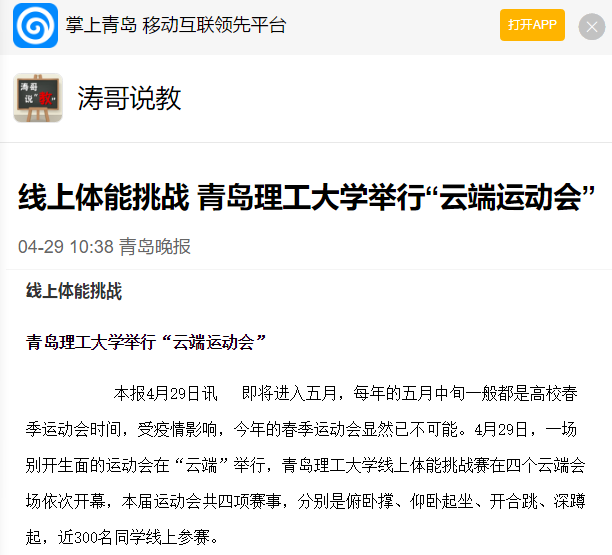 记者了解到,本次云端运动会旨在提高同学们居家学习期间的身体素质,增进同学们的锻炼意识,以赛促炼,提升新时代大学生的综合素养。赛事结束后,学校将根据名次给予参赛选手相应的奖励。