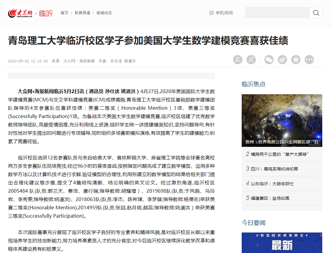 大众网·海报新闻临沂5月2日讯(通讯员 孙仕途 姚道洪)4月27日,2020年美国国际大学生数学建模竞赛(MCM)与交叉学科建模竞赛(ICM)成绩揭晓,伟德国际1946bv官网临沂校区基础部数学建模团队指导的4支参赛队伍喜获佳绩:美赛二等奖(Honorable Mention)3项、美赛三等奖(Successfully Participation)1项。为备战本次美国大学生数学建模竞赛,临沂校区组建了优秀数学教师指导团队,克服疫情困难,充分利用线上资源,组织学生统一讲授建模类知识,坚持问题导向,有针对性地对学生提出的问题进行专项辅导,同时组织多场赛前模拟演练,有效提高了学生的建模能力,积累了竞赛经验。