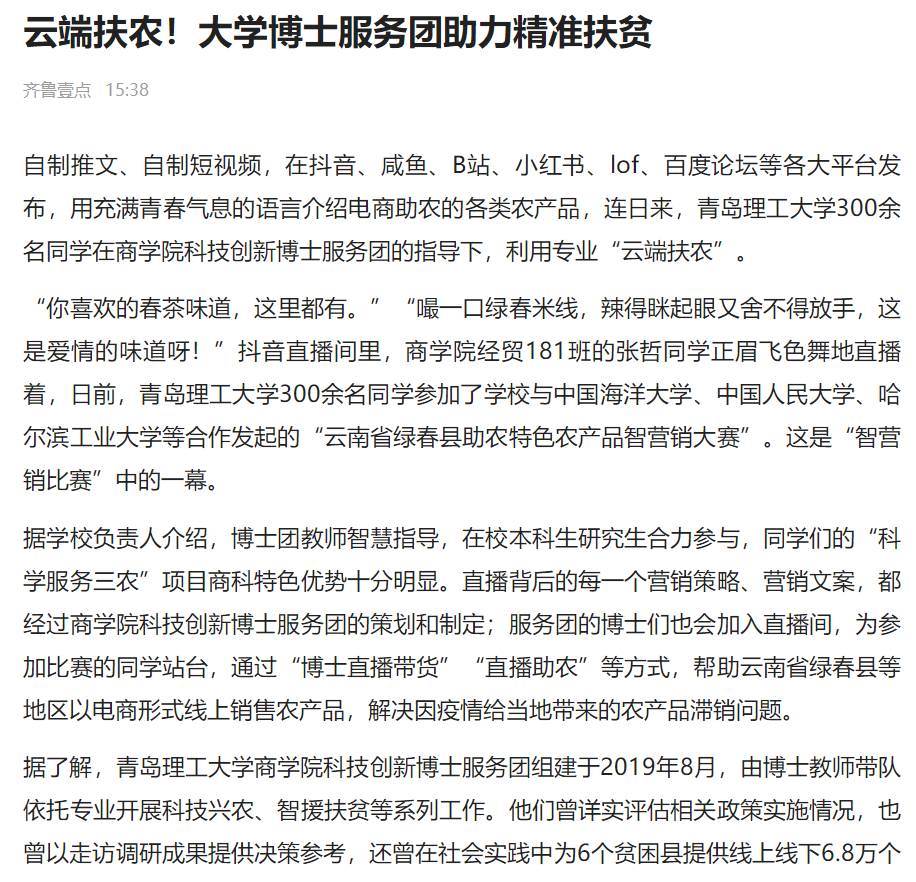 据学校负责人介绍,博士团教师智慧指导,在校本科生研究生合力参与,同学们的“科学服务三农”项目商科特色优势十分明显。直播背后的每一个营销策略、营销文案,都经过商学院科技创新博士服务团的策划和制定;服务团的博士们也会加入直播间,为参加比赛的同学站台,通过“博士直播带货”“直播助农”等方式,帮助云南省绿春县等地区以电商形式线上销售农产品,解决因疫情给当地带来的农产品滞销问题。