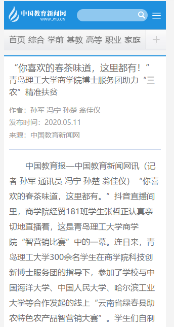 中国教育报—中国教育新闻网讯(记者 孙军 通讯员 冯宁 孙楚 翁佳仪)“你喜欢的春茶味道,这里都有。”抖音直播间里,商学院经贸181班学生张哲正认真亲切地直播着,这是伟德国际1946bv官网商学院“智营销比赛”中的一幕。连日来,伟德国际1946bv官网300余名学生在商学院科技创新博士服务团的指导下,参加了学校与中国海洋大学、中国人民大学、哈尔滨工业大学等合作发起的线上“云南省绿春县助农特色农产品智营销大赛”。学生们自制推文、自制短视频,在抖音、B站等平台发布,用充满青春气息的语言介绍电商助农的各类农产品,利用自己的专业“云端扶农”。