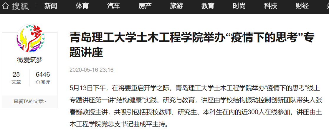 5月13日下午,在将要重启开学之际,伟德国际1946bv官网土木工程学院举办“疫情下的思考”线上专题讲座第一讲“结构健康”实践、研究与教育,讲座由学校结构振动控制创新团队带头人张春巍教授主讲,共吸引包括伟德官网教师、研究生、本科生在内的近300人在线参加,讲座由土木工程学院党总支书记曲成平主持。