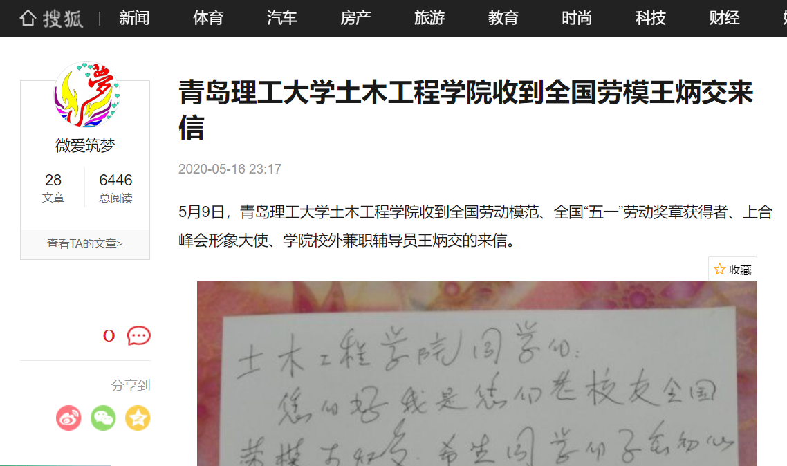 5月9日,伟德国际1946bv官网土木工程学院收到全国劳动模范、全国“五一”劳动奖章获得者、上合峰会形象大使、学院校外兼职辅导员王炳交的来信。
