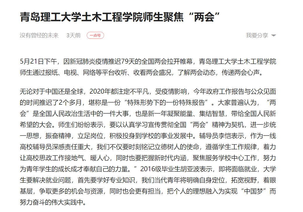 无论对于中国还是全球,2020年都注定不平凡,受疫情影响,今年政府工作报告与公众见面的时间推迟了2个多月,堪称是一份“特殊形势下的一份特殊报告”。大家普遍认为,“两会”是全国人民政治生活中的一件大事,也是新一年凝聚能量、集结智慧,带给全国人民新希望的大会。师生们纷纷表示,要以认真学习宣传贯彻全国“两会”精神为契机,进一步统一思想,振奋精神,立足岗位,积极投身到学校的事业发展中。辅导员李恺表示,作为一线高校辅导员深感责任重大,我们不仅要时刻铭记立德树人的使命,遵循学生工作规律,着力让高校思政工作接地气、暖人心,同时也要把握新时代内涵,聚焦服务学校中心工作,努力为青年学生的成长成才奉献自己的力量。”2016级毕业生胡亚波表示,即将面临就业,大学生要解决就业问题,首先要学好专业知识,我们当代青年将明确自身定位,拓宽视野,着眼基层,争取更多的机会与资源,同时也会更有担当,把个人的理想融入为实现“中国梦”而努力奋斗的伟大实践中。